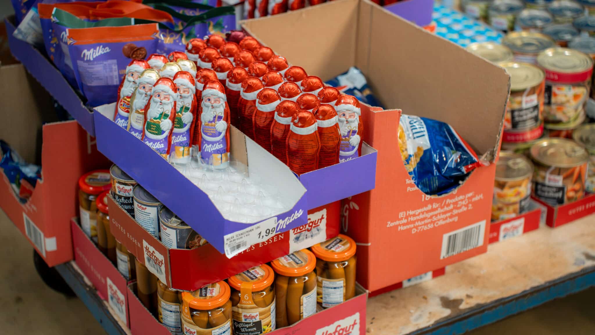 Unter den überreichten Produkten befanden sich zum einen Weihnachtsmänner aus Schokolade und weitere weihnachtliche Leckereien. Zum anderen übergaben Schwab und Weiner ausgewählte Lebensmittel von Hofgut, einem offiziellen Partner unserer KSV Holstein. Darunter waren Grundnahrungsmittel wie Nudeln und Reis, aber auch Würstchen, Fisch und Konserven.