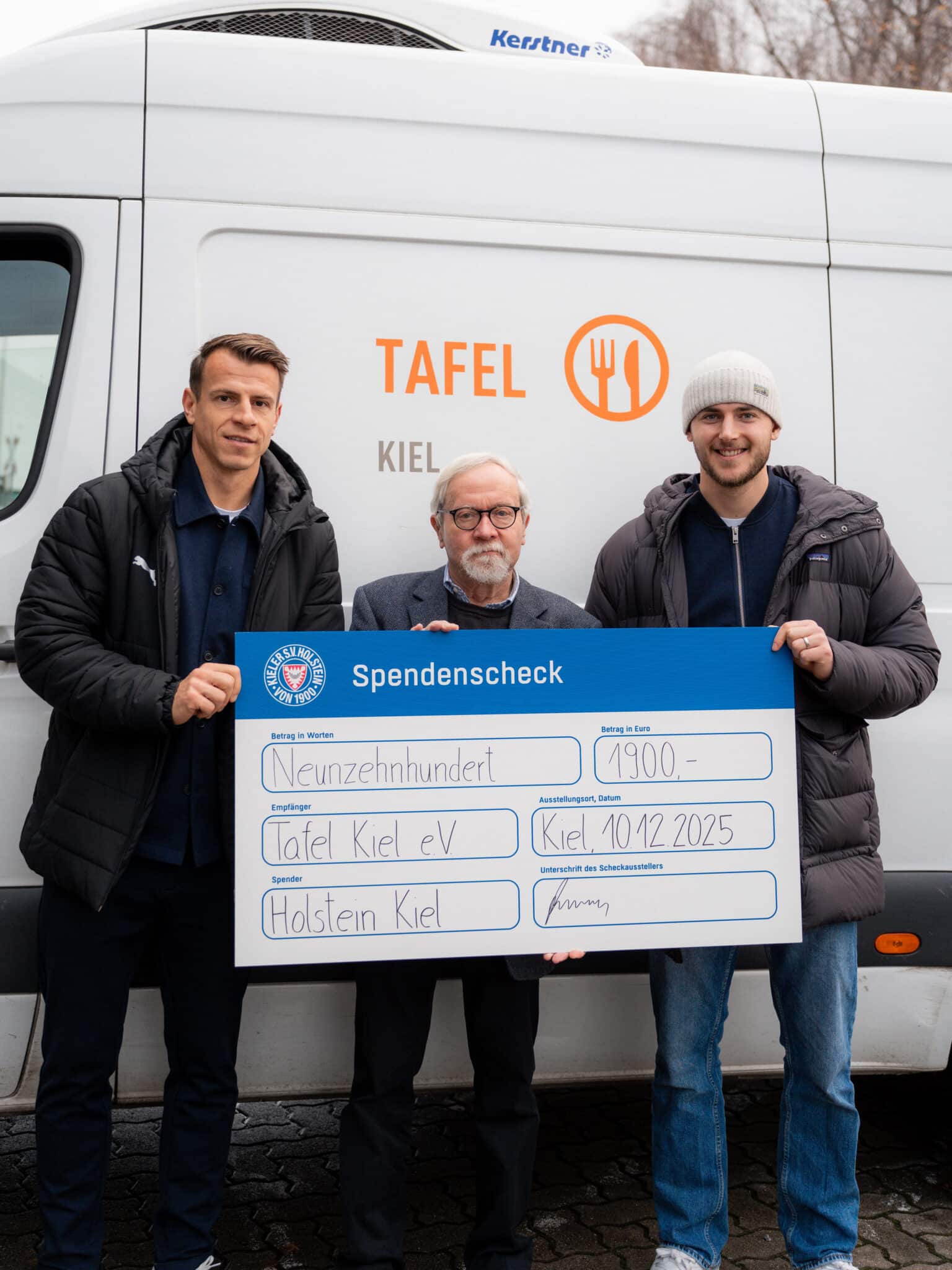 Wie in den vergangenen Jahren, spendet die KSV Holstein zum Ende des Jahres traditionell an soziale Einrichtungen in der Region. Kurz vor Weihnachten haben die Störche-Profis Stefan Schwab und Timon Weiner daher dem Tafel Kiel e.V. eine festliche Spende überreicht. Neben einem Spendenscheck in Höhe von 1.900 Euro brachten die beiden Profis auch zahlreiche Lebensmittelspenden mit. Wolfgang Schwenke, Kaufmännischer Geschäftsführer der KSV Holstein, sagte zu diesem Anlass: „Die Tafel Kiel leistet unerlässliche Arbeit für die Region. Mit großem Engagement unterstützt sie Menschen, die auf Hilfe angewiesen sind, und sorgt dafür, dass die gespendeten Lebensmittel dort ankommen, wo sie dringend gebraucht werden. Durch ihren unermüdlichen Einsatz schafft die Tafel Kiel mit ihren vielen ehrenamtlichen Helfern nicht nur Entlastung im Alltag vieler Menschen, sondern vermittelt zugleich Würde, Teilhabe und Zuversicht.“