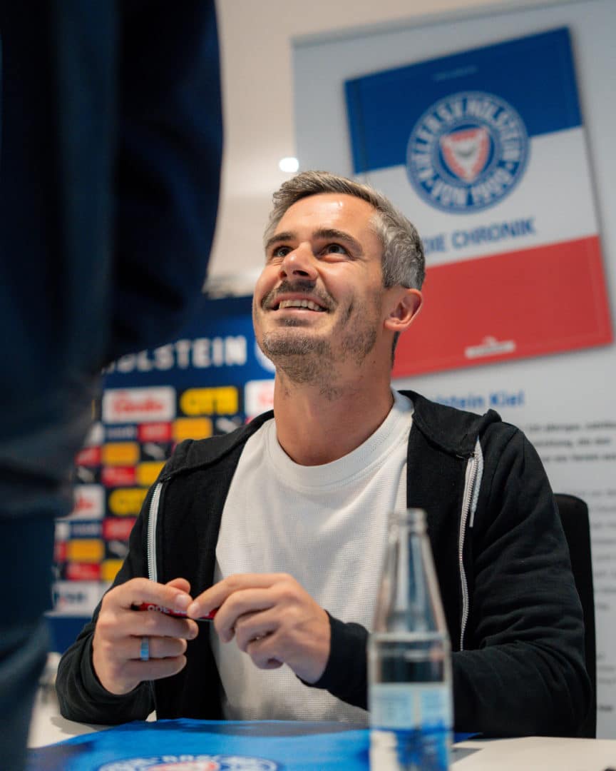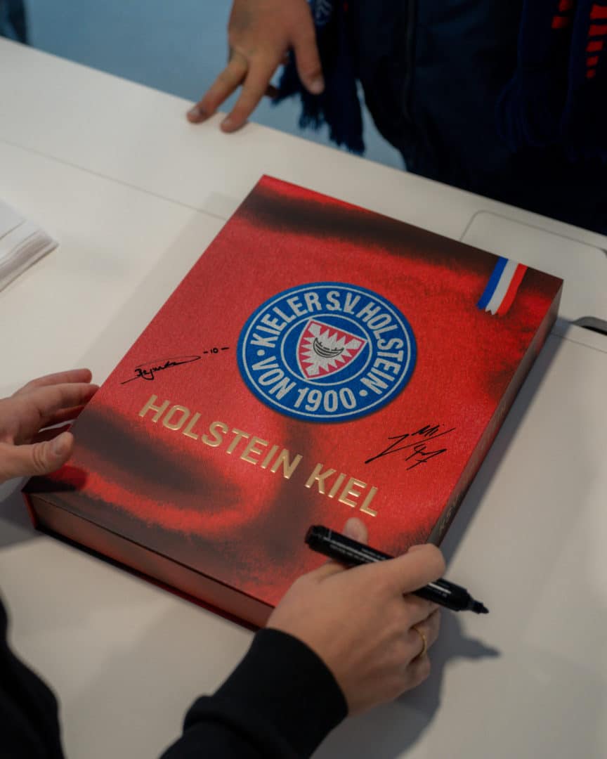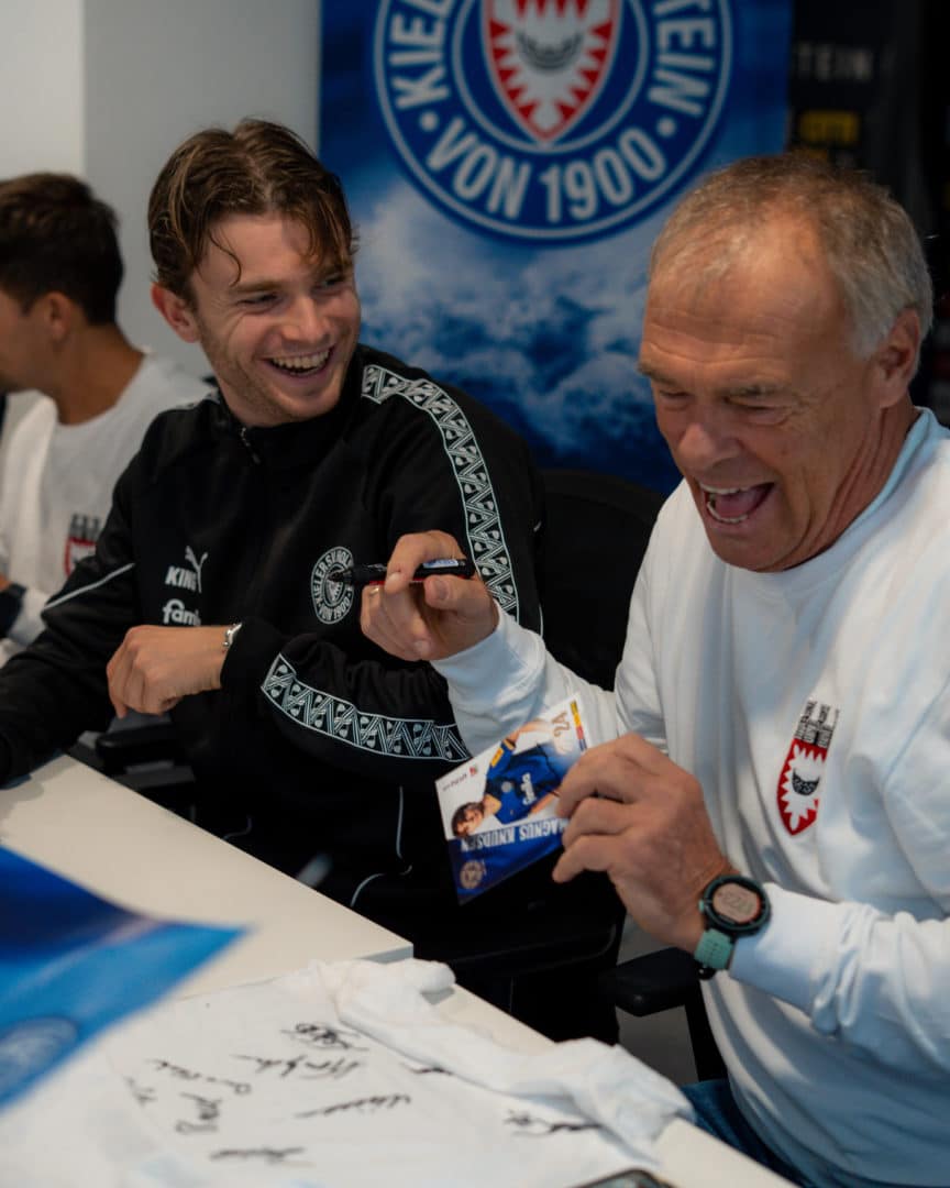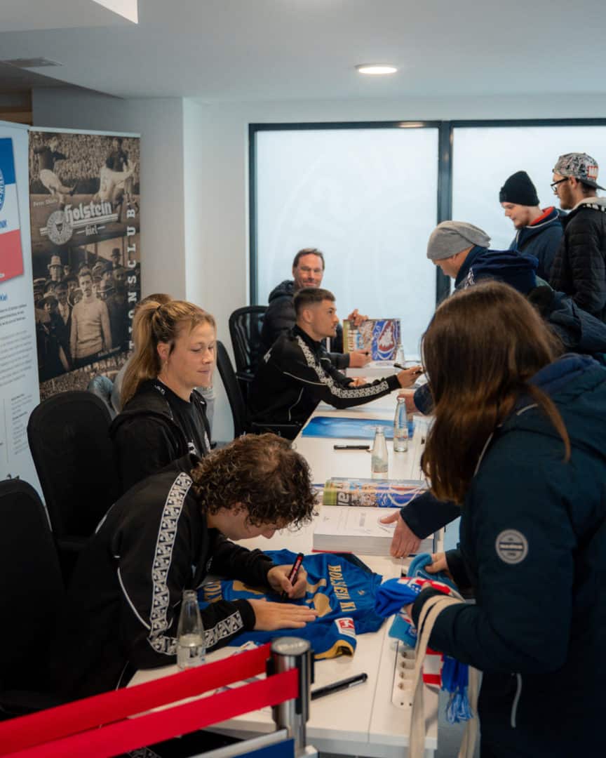 Dem norddeutschen Herbstwetter zum Trotz bildeten dutzende Holstein-Fans bereits im Vorfeld der Autogrammaktion eine lange Schlange vor der Mixed Zone des Holstein-Stadions. An die Wartenden wurde Kaffee oder passend zum Anlass auch alkoholfreier Sekt sowie Orangensaft verteilt, sodass auf den 125. Geburtstag unserer KSV standesgemäß angestoßen werden konnte.
