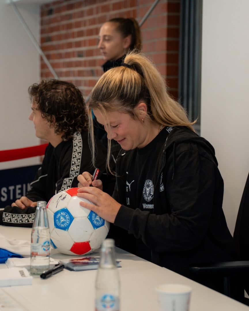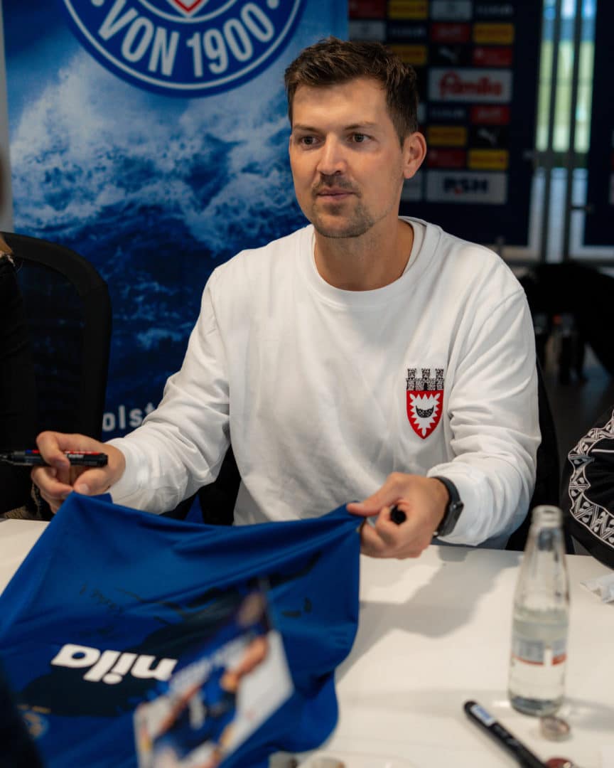Zahlreiche Holstein-Fans ließen es sich trotz des regnerischen Wetters nicht nehmen, am Tag des 125. Vereinsjubiläums der KSV zur großen Autogrammaktion am Holstein-Stadion zu kommen. Dort konnten sie ihre Lieblingsspielerinnen und -spieler sowie einige Legenden ihres Herzensvereins persönlich treffen.