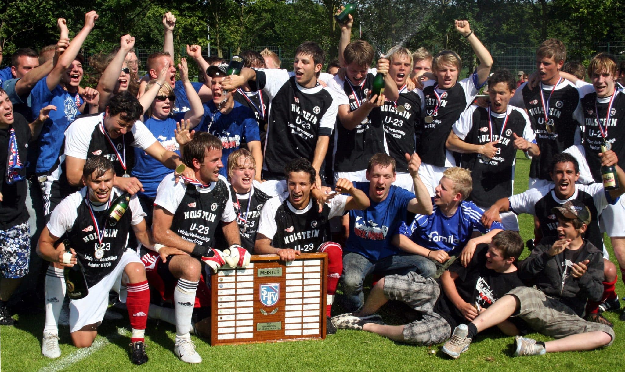 Trainer Hans Friedrich Brunner war mit Holsteins U23 von 2004 bis 2007 sehr erfolgreichTeamfoto Holstein U19 Saison 2006 2007Aufstieg in die A Junioren Bundesliga 2006Im April 2006 feiern die Holstein Fans am Hamburger Millerntor die Kieler Nachwuchshoffnung Fin BartelsAufstieg in die B Junioren Bundesliga im Sommer 2007Sektdusche für Trainer Dirk Asmussen nach den Wiederaufstieg in die U19 Bundesliga im Mai 20062008 feierte Holsteins U23 die Meisterschaft auf dem Kiliaplatz2008 feierte Holsteins U19 den Gewinn des Landespokals2008 wurde Holsteins U23 Meister der Verbandsliga Schleswig HolsteinHolsteins U17 feiert 2009 im Holstein Stadion den Klassenerhalt in der Junioren Bundesliga2009 scheiterte die U23 um Heiko Petersen in den Regionalliga Aufstiegsspielen am FC St Pauli IIDie erfolgreiche U17 durfte 2011 Bundesliga Aufstieg und Pokalsieg feiernHolsteins U17 Trainerteam 2009 mit Bruno Gonda Jan Sandmann Torsten Flocken Heinz Siebolds und Siegfried FörsterHolsteins langjähriger Nachwuchsmitarbeiter Michael Wuttke im Sommer 2011Kieler Fans beim U17 Aufstieg 2011Holsteins U16 feierte am Ende der Saison 2016 2017 unter Trainer Jan Uphues den Aufstieg in die B Junioren RegionalligaMeister und Aufstiegsjubel bei der U19 im Sommer 2012Am 17 November 2018 besiegte Holsteins U23 sensationell die erste Mannschaft des VfB LübeckIn der Saison 2018 2019 schaffte die U19 unter Trainer Glawogger den Wiederaufstieg in die Junioren BundesligaJubel in der Regionalliga Aufstiegsrunde im Mai 2018 bei bei Jan Matti Seidel Laurynas Kulikas und Timo BarendtU23 Trainer Ole Werner im November 20182019 schaffte die U19 unter Trainer Dominik Glawogger den Wiederaufstieg in die Junioren BundesligaAm 30 Mai 2018 feierte die U23 unter Trainer Ole Werner den Regionalliga AufstiegHolsteins U19 Kapitän Ove Witt im DFB Junioren Pokalspiel im Dezember 2022 in KölnRL Nord 2022-23 VfB Lübeck – Holstein Kiel IIAm 24 Juni 2023 feierte Holsteins U17 den Wiederaufstieg in die A Junioren BundesligaHolsteins U23 Staff im Juli 2023 im Stade Creux Bleue Medavie im kanadischen MonctonHolsteins U17 Torwart Lio Rothenhagen im Juni 2023 in der Bundesliga Relegation gegen TB BerlinDas U23 Trainerteam mit Justus Hetenyi Niklas Jakusch Sebastian Gunkel und Sven Boy im Juli 2023 in KanadaHolsteins Urgestein Siegfried Förster war seit den 80er Jahren als Jugendtrainer und später Stadionsprecher aktivU23 Trainer Torsten Fröhling war bei den Kieler Fans äußerst beliebt